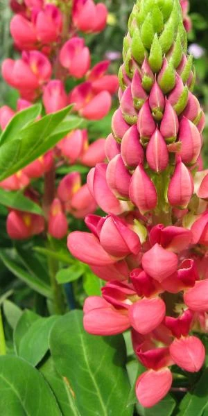 ย Tall, densely packed spikes of light red flowersย with a darker standard appear during summer. The blooms which are heavily fragrant stand aboveย palmate-shaped green foliage.